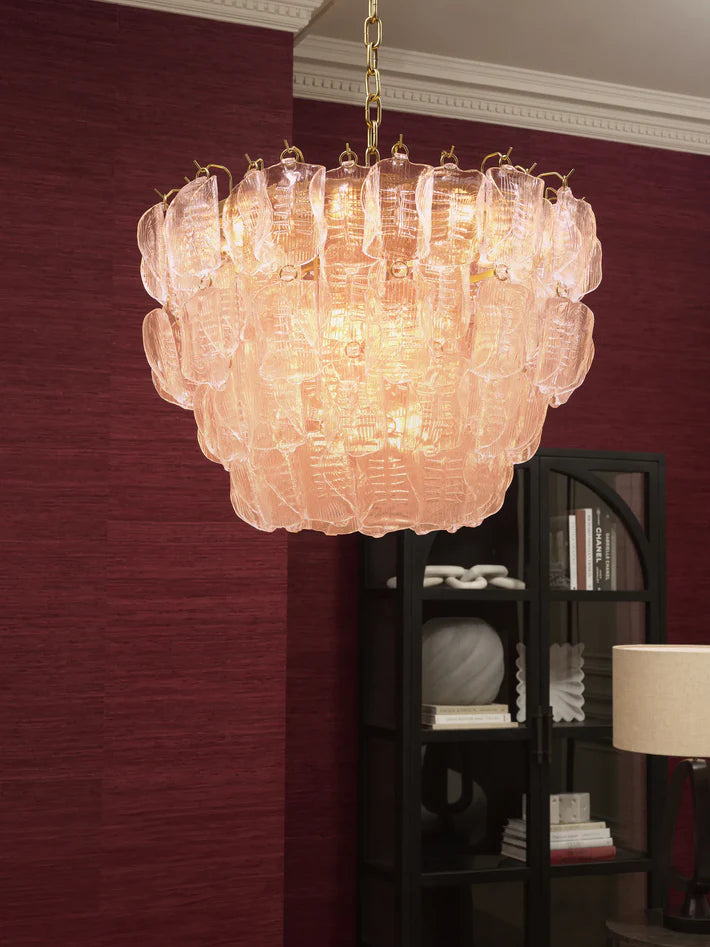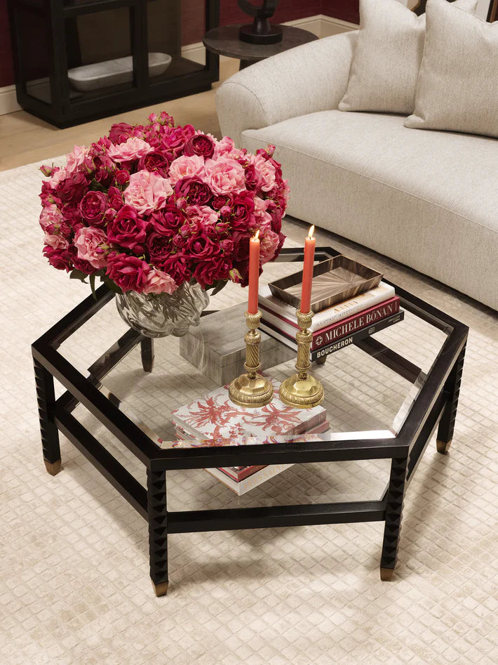 This thoughtfully composed living space juxtaposes expressive forms and tactile finishes to create an artful, balanced interior. At its heart, a singular sculptural coffee table in honed stone draws the eye, surrounded by side tables and vases in hand-worked glass and subtle metal accents that play against one another in scale and sheen.