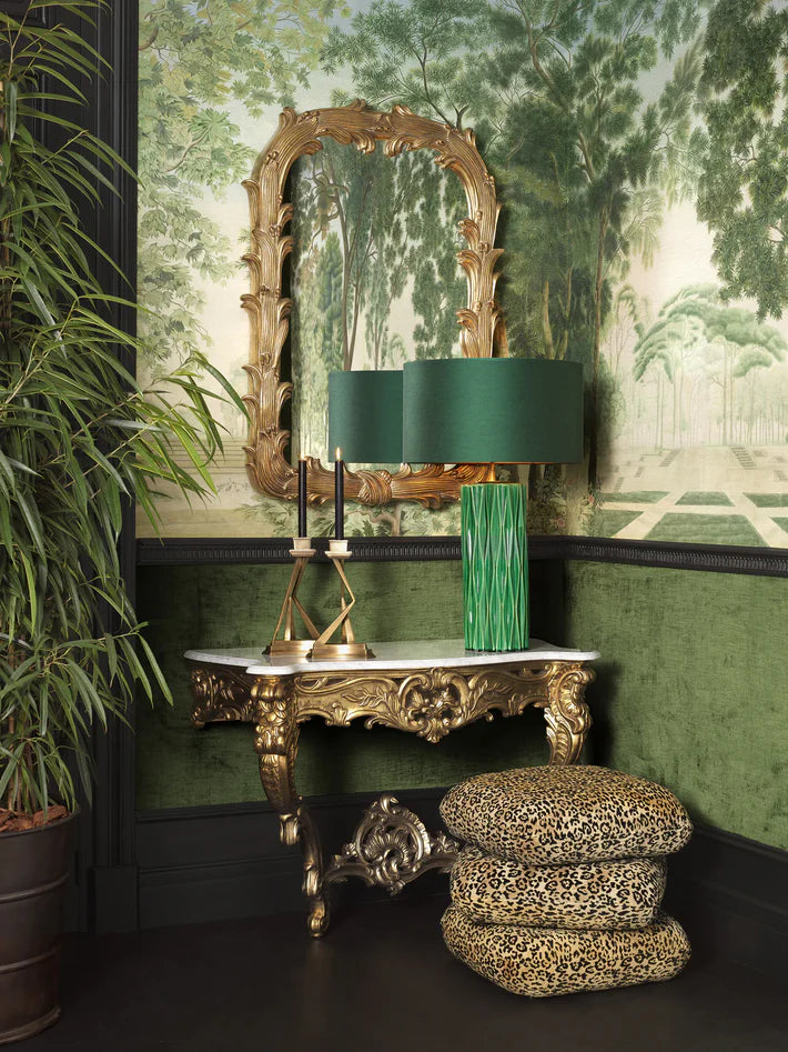 Vintage-toned mirrors and planters add depth and shimmer, offset by hand-blown glass vases and textured decorative boxes that articulate subtle colour and form. Soft pillows and artistic frames provide warmth and human scale, and brass serving trays and sculptural candle holders offer luminous accents.