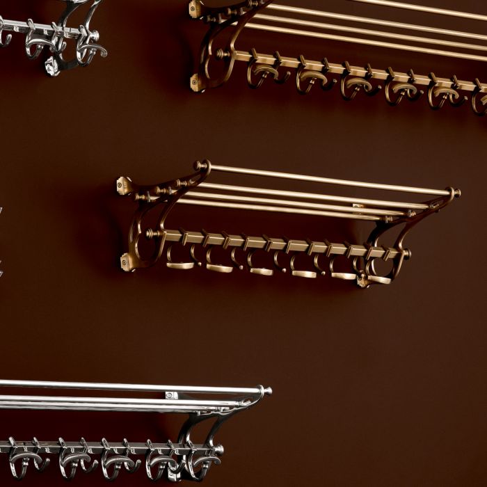 The brass finished Hudson L Coatrack is reminiscent of the luggage racks in old steam trains.