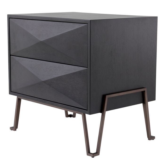 The Highland Nightstand combines a medium bronze finish frame with charcoal brown oak veneer.