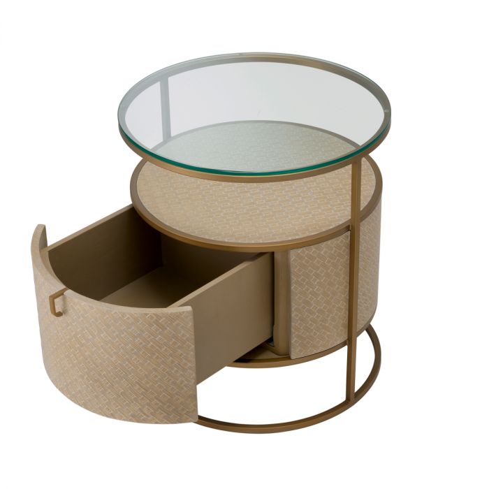 Pairing Bauhaus style with a Mid-Century Modern look, the tapered Napa Valley Nightstand showcases a sleek brushed brass finished frame, a clear glass tabletop and a drum-shaped centrepiece that is lined with woven washed oak veneer, containing a drawer with a stainless steel handle.
