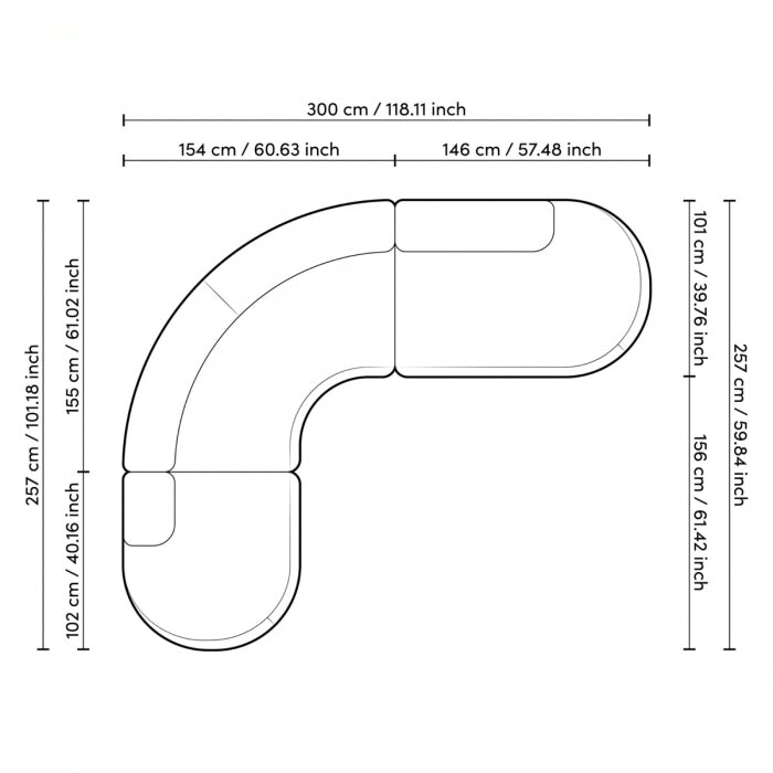 - W. 300 | D. 257 | H. 70 | SD. 72 | SH. 43 cm cm