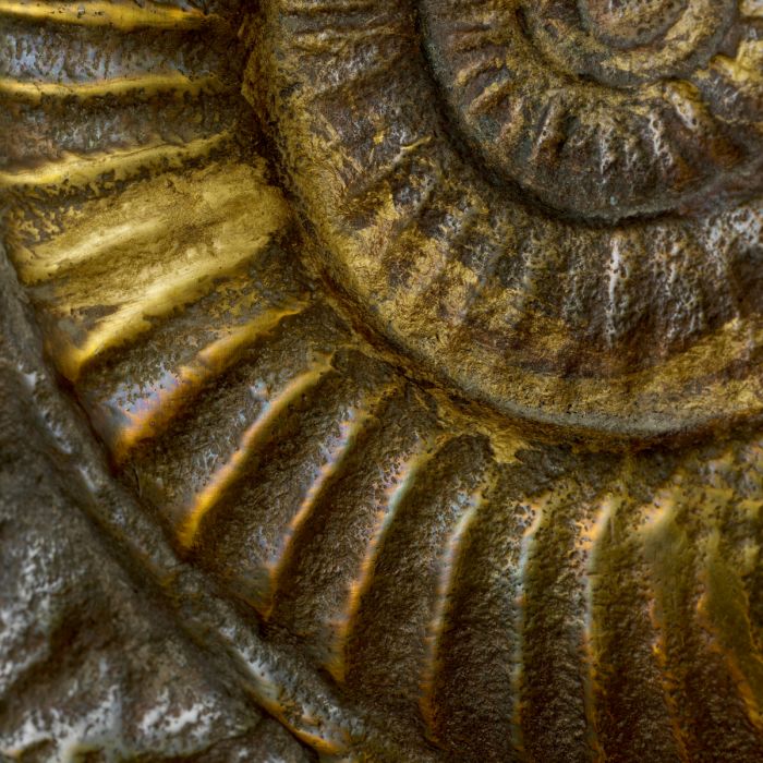 The Kamari Table Lamp features a vintage brass finish and a large, hand-casted base adorned with detailed fossil designs.