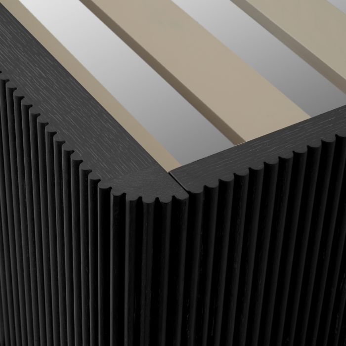 The Dimitrios bed frame features charcoal grey ribbed mahogany wood, complemented by natural Durini fabric.