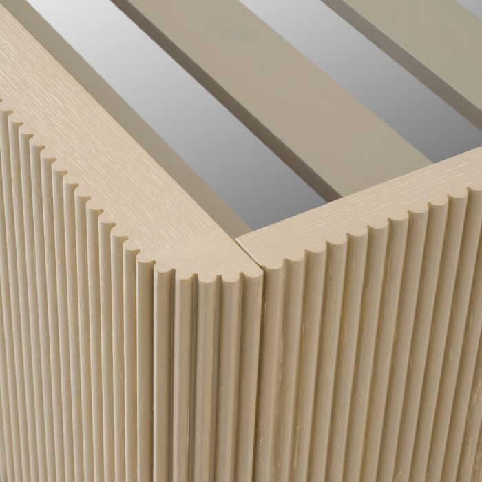 The Dimitrios bed frame features ribbed solid wood in a light color, complemented by natural Durini fabric.