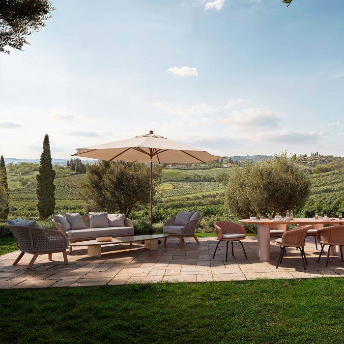 Elevate your outdoor sanctuary with the Outdoor Chair Trinity in cream weave and viola sand.