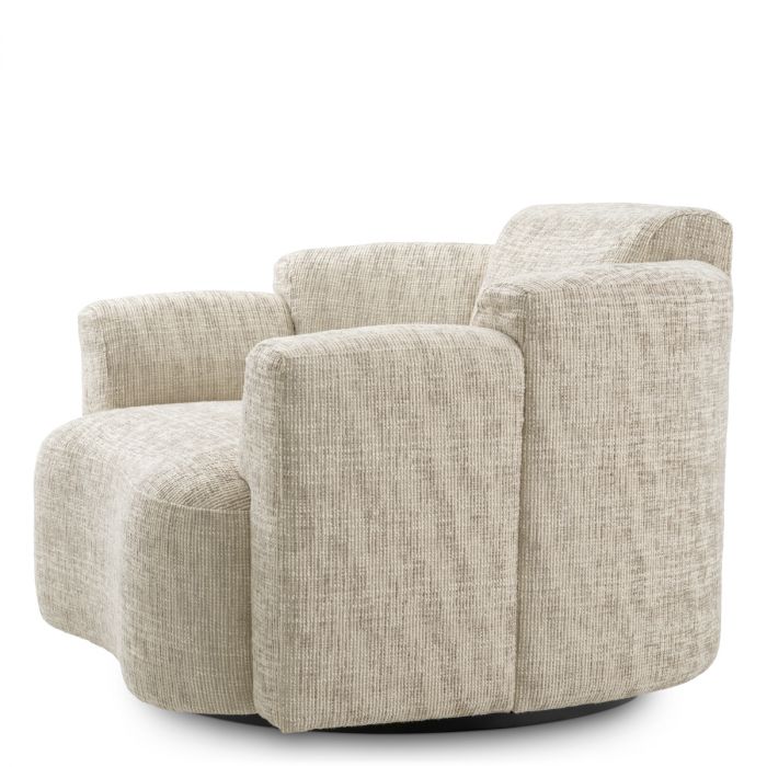 The Swivel Chair Marbella in Creststone beige features a smooth fabric finish and a sleek black base, combining warm tones with modern design.
