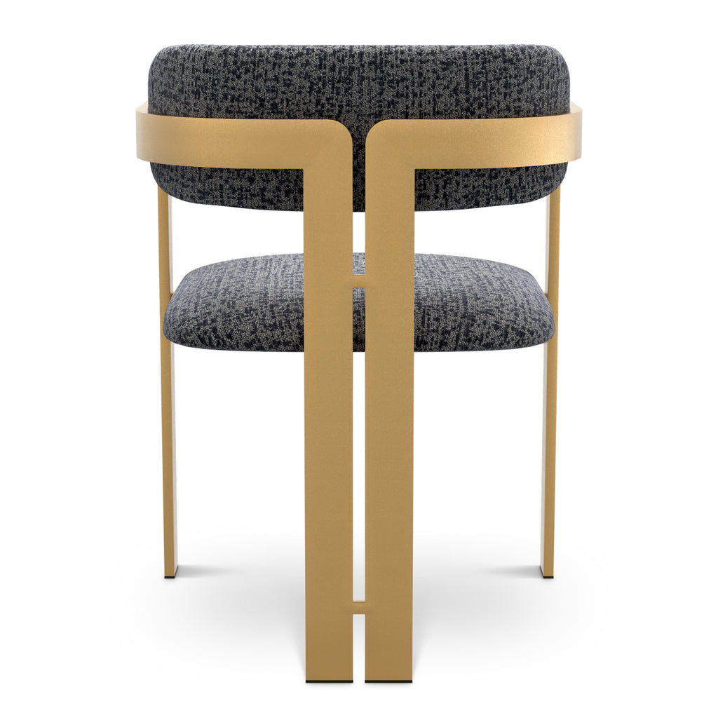 With its distinctive silhouette, the armrests of this chair merge effortlessly into the front legs, and the curved backrest is supported by two sleek rear legs. The seat is upholstered in Montclair blue fabric, complemented by a brushed brass finish frame for a polished and stylish look. A statement piece that blends functionality with contemporary elegance.