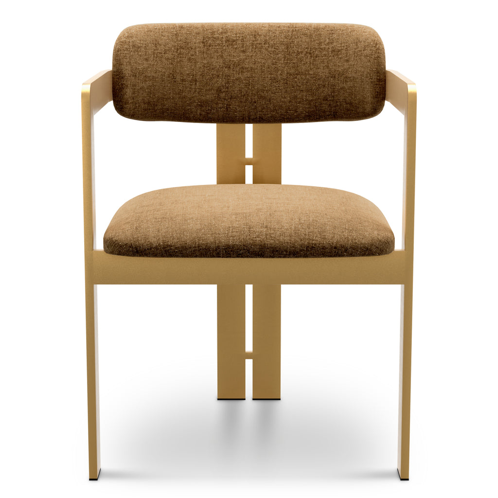 With its distinctive silhouette, the armrests of this chair merge effortlessly into the front legs, and the curved backrest is supported by two sleek rear legs. The seat is upholstered in hastings camel fabric, complemented by a brushed brass finish frame for a polished and stylish look. A statement piece that blends functionality with contemporary elegance.