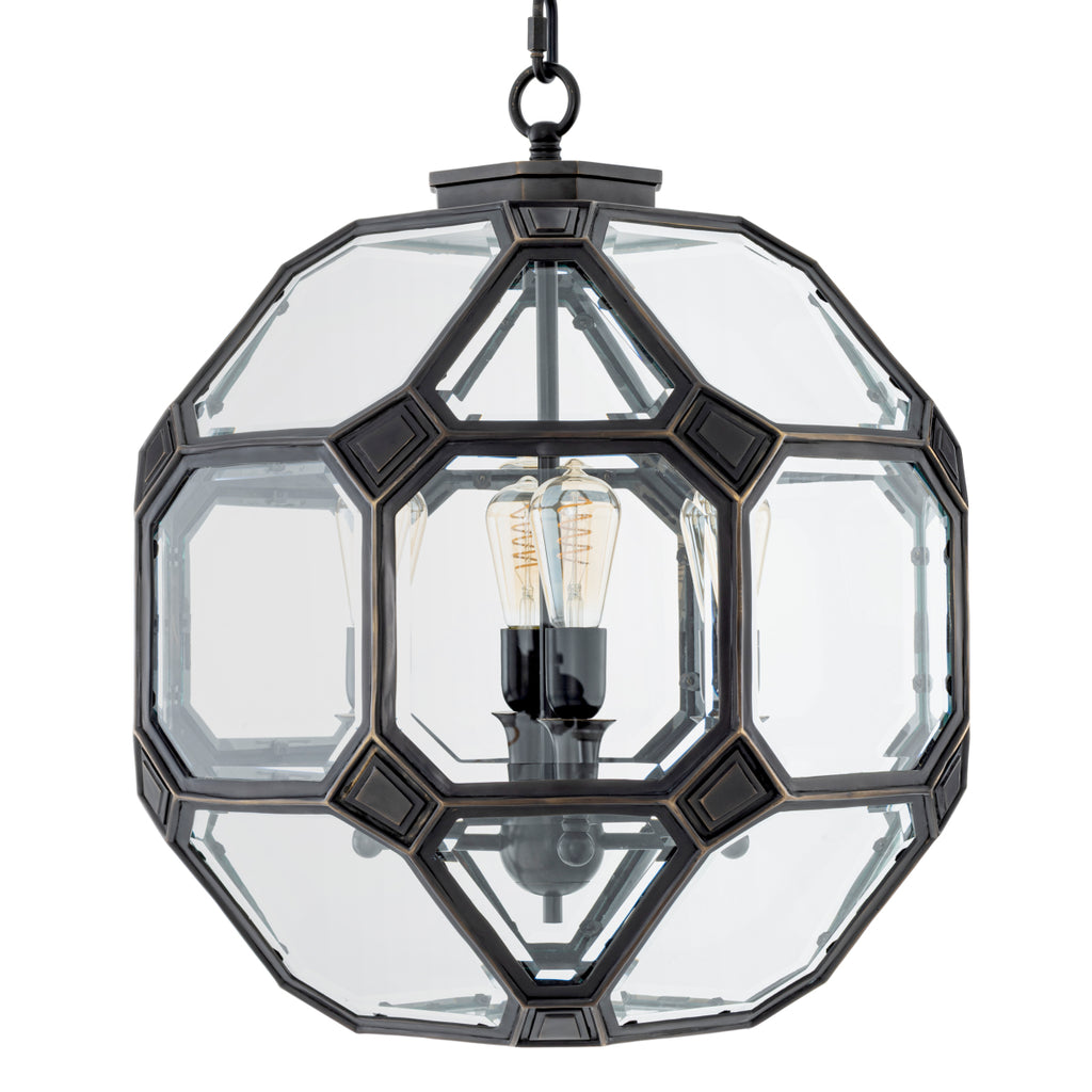 Explore the Eichholtz Olympia Lantern, designed in collaboration with interior designer Corey Damen Jenkins. Handcasted from solid brass, finished in a bronze finish with highlighted details and enclosed in bevelled glass panels, the fixture captures light beautifully. Floating within its transparent shell are exposed bulbs providing a warm glow. Available in two sizes, Olympia offers a luminous sphere of modern craftsmanship.