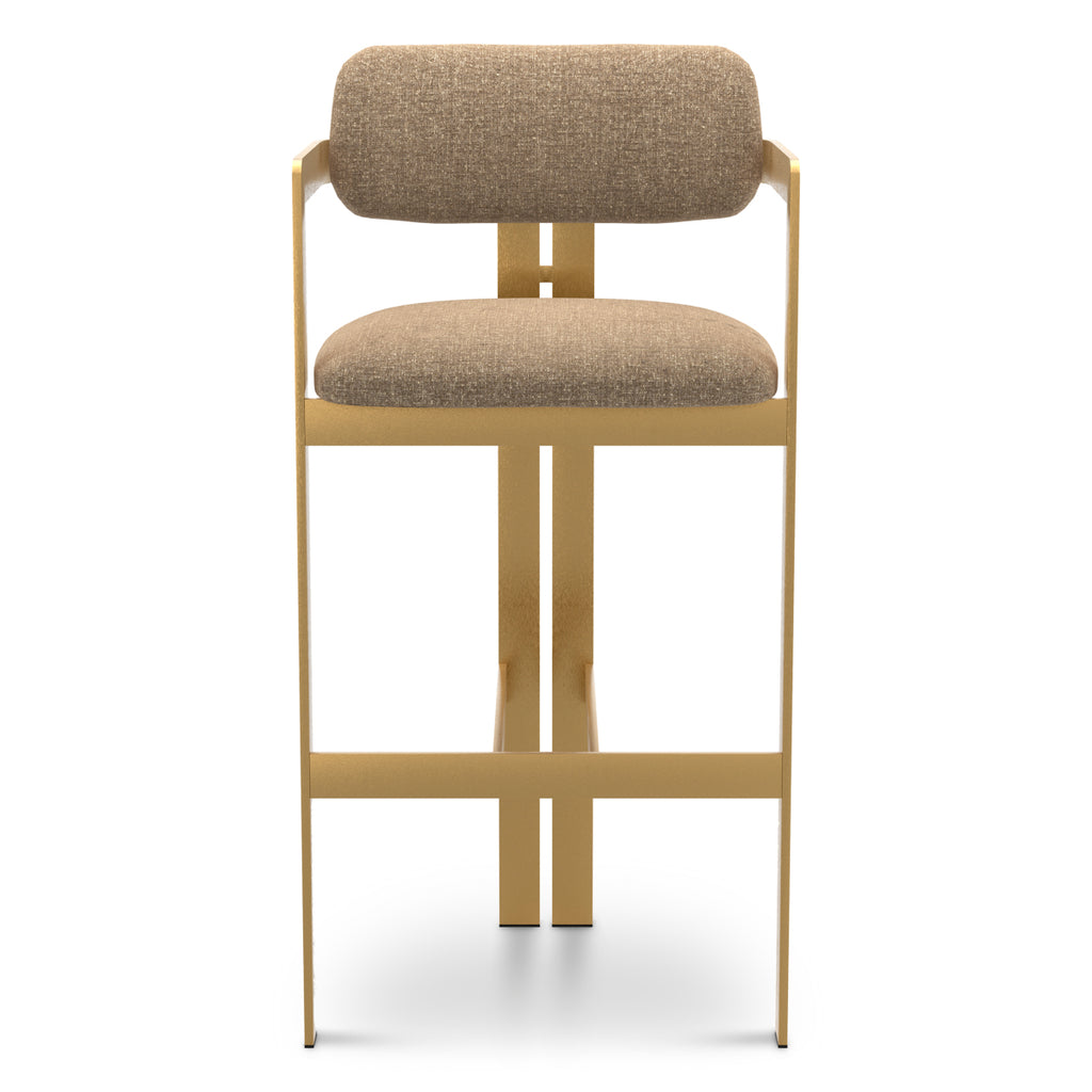 Add elegance and comfort to your bar area with the Donato Bar Stool in Muslin White. Featuring a modern silhouette where the armrests extend into the front legs and the rounded backrest rests on rear legs, this accent stool makes a stylish statement from every angle. The Muslin white upholstery is thoughtfully designed to be customized with a fabric of your choice, giving you the freedom to personalize it for your space.