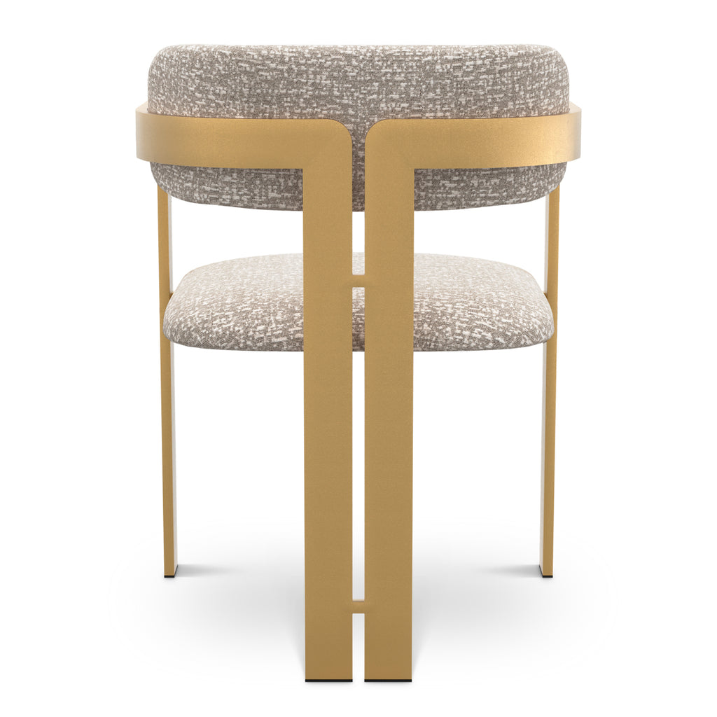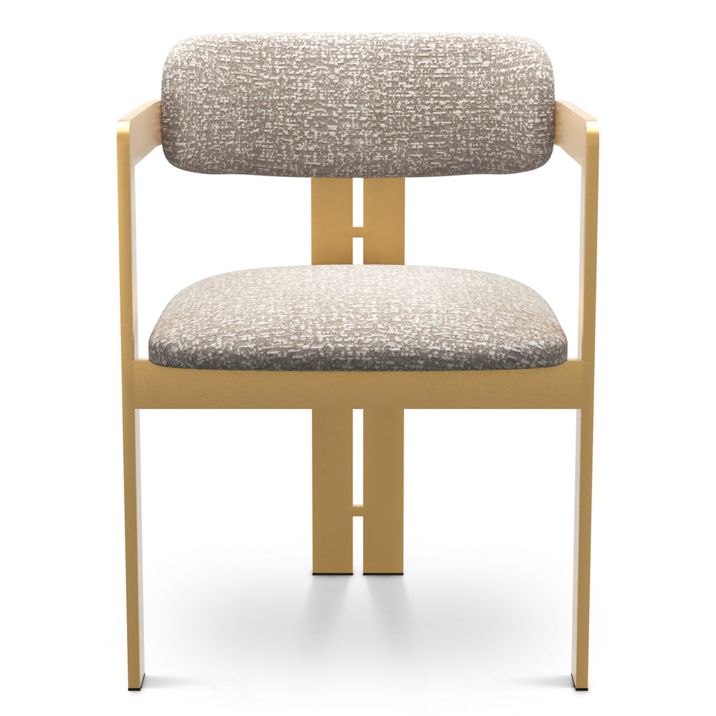 With its distinctive silhouette, the armrests of this chair merge effortlessly into the front legs, and the curved backrest is supported by two sleek rear legs. The seat is upholstered in Montclair silver fabric, complemented by a brushed brass finish frame for a polished and stylish look. A statement piece that blends functionality with contemporary elegance.