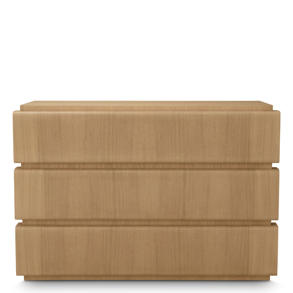 The Colston Drawer Dresser features natural oak veneer with drawers that subtly extend on the sides, adding distinctive character. Its warm wood grain and clean lines combine practical storage with refined style, making it a standout piece in any sophisticated setting.